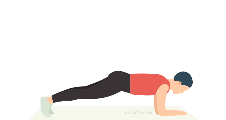 - Lower yourself onto your elbows and straighten your legs behind you, keeping your feet hip-width apart.